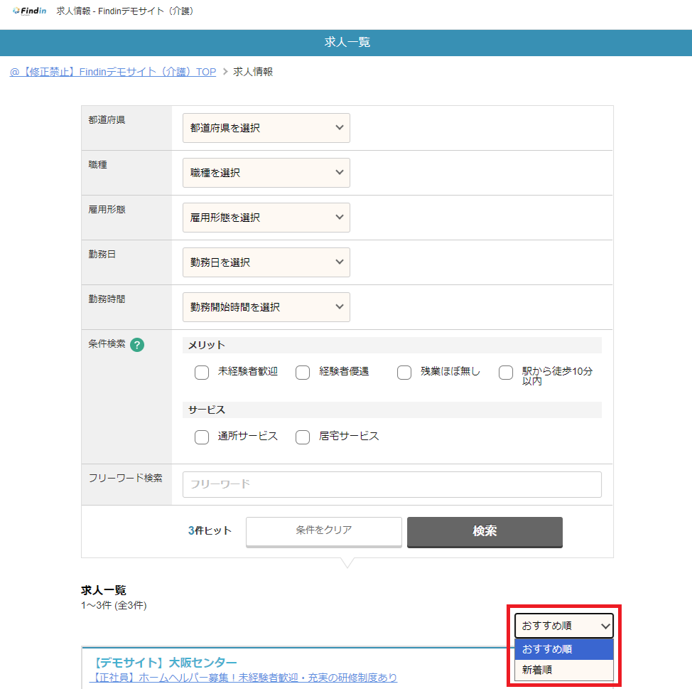求人一覧のソート機能をOFFにしている場合でも、入力されているソート用項目に基づいて、求人の表示順が決まります。