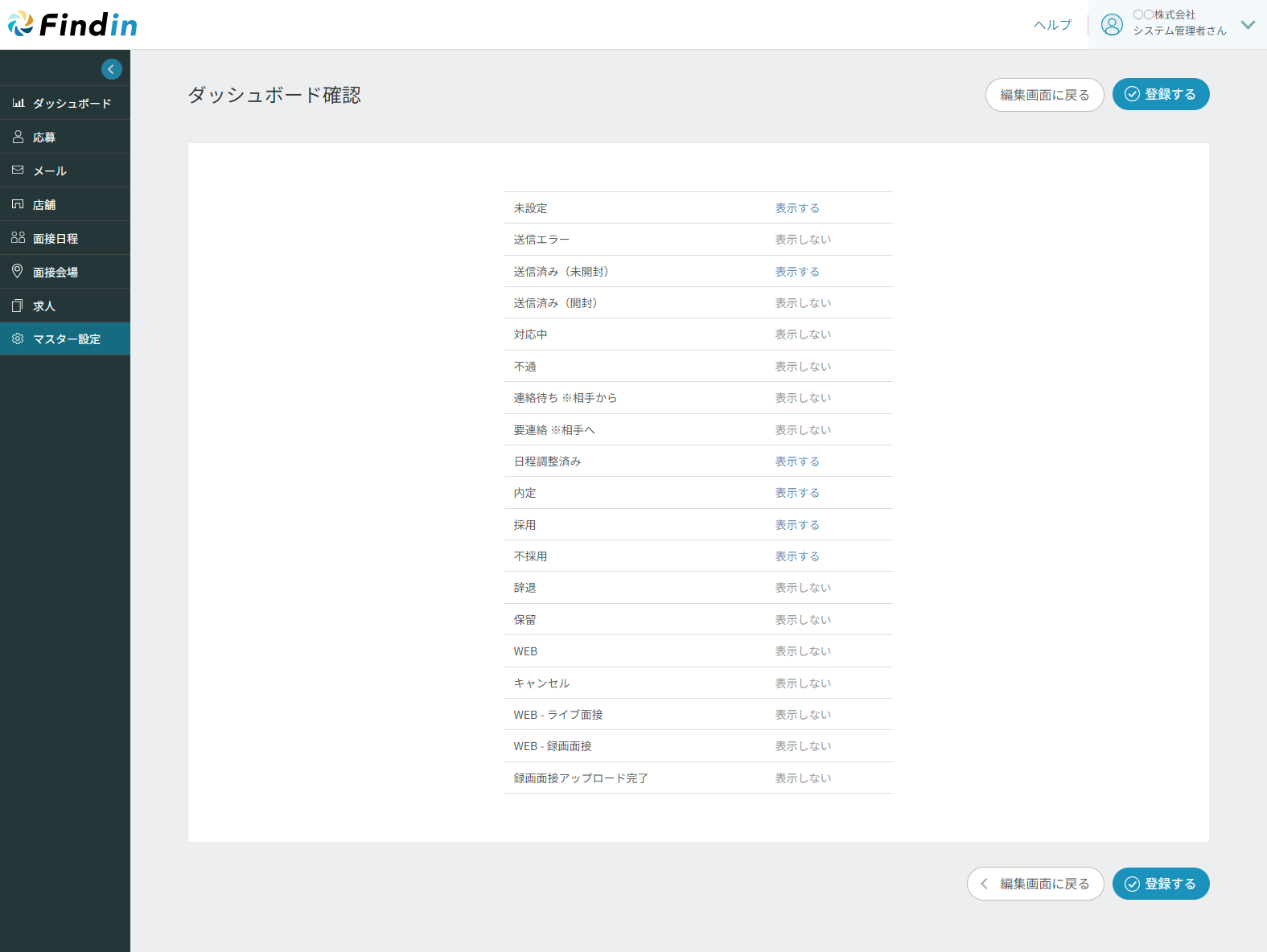 ダッシュボードに表示したい「選考ステータス」の横にある「表示する」にチェックを入れ、確認画面へ進みます。
