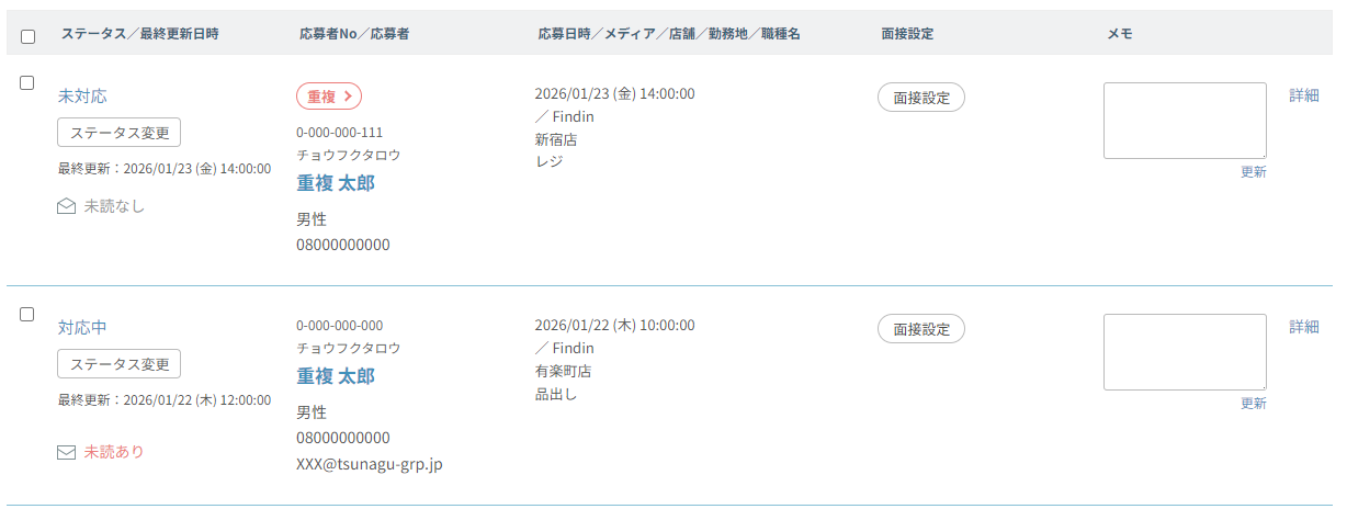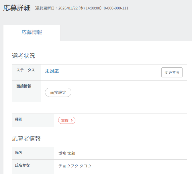これにより、過去に応募したことのある応募者を把握しやすくなり、二重対応を防ぐことができます。
